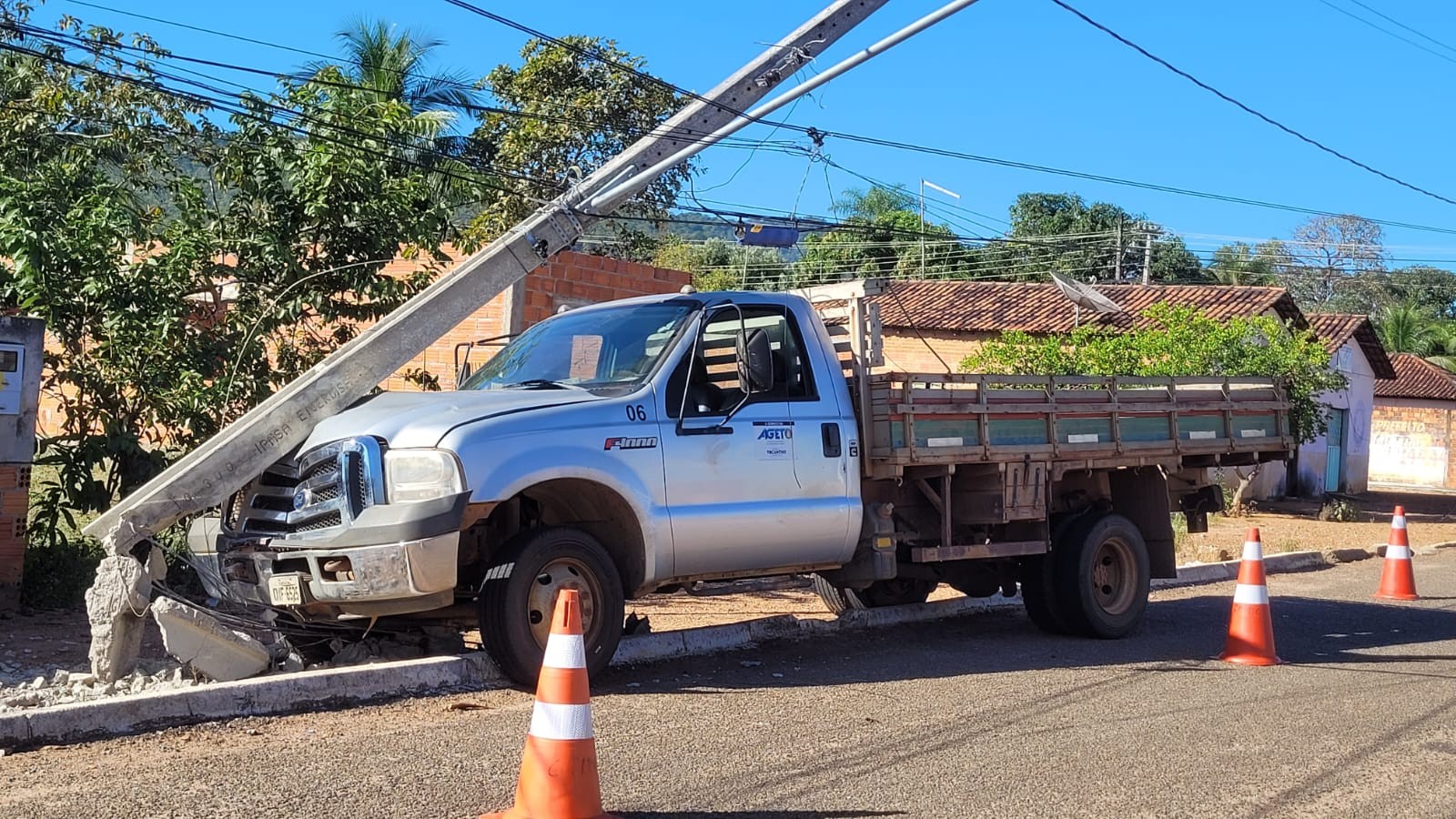Abalroamentos tiveram redução com relação ao mesmo período de 2022, que registrou 167 casos. Mesmo assim, o número é preocupante, segundo a Energisa. Poste é derrubado por caminhonete, em Monte do Carmo na quinta-feira (4)