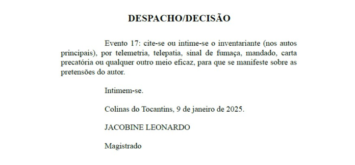 Trecho do documento foi publicado nas redes sociais e chamou atenção de internautas. Processo envolve um inventário de R$ 3 milhões, com terras em Couto Magalhães. Juiz determinou citação de parte em processo por telepatia