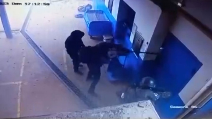 Criminosos abrindo porta que dá acesso ao cofre de transportadora