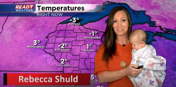 Na última semana, Rebecca apresentou a previsão do tempo na região de Milwaukee, nos Estados Unidos, com a bebê, de 13 semanas, no colo.